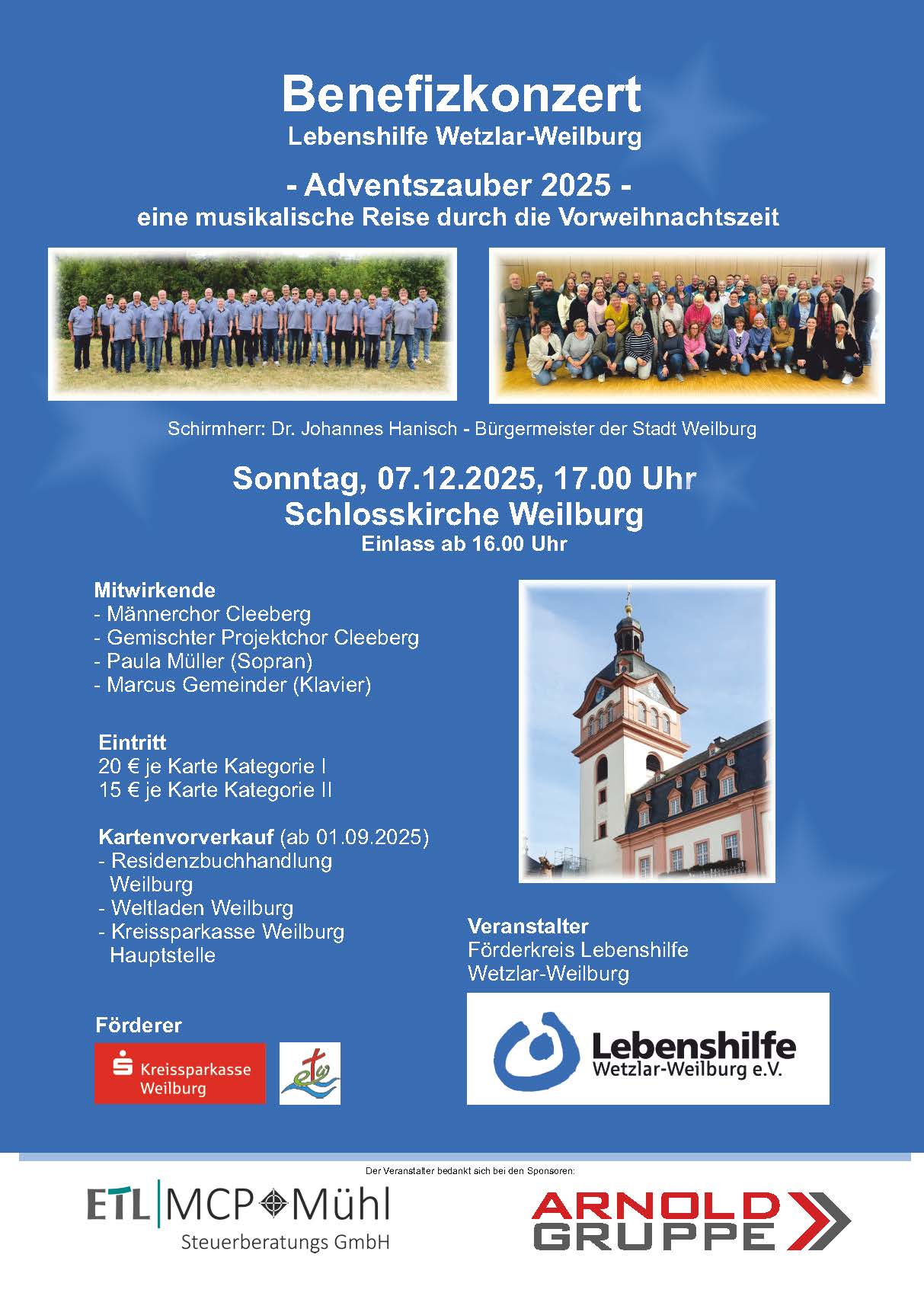 Der Förderkreis der Lebenshilfe Wetzlar-Weilburg e. V. lädt am Sonntag, 7. Dezember, zu einem Benefizkonzert in die Weilburger Schlosskirche ein. Beginn ist um 17 Uhr, Einlass bereits um 16 Uhr.