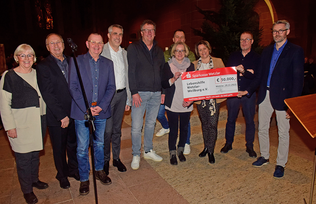 Im Rahmen des alljährlichen Benefizkonzertes im Wetzlarer Dom überreichte der Förderkreis seine Jahresspende an die Lebenshilfe Wetzlar-Weilburg e. V. und sorgte damit einmal mehr für dankbare und glückliche Gesichter. Durch Erlöse aus Tombola, Kartoffelfest und Jahreskonzert kam eine stolze Summe von 50.000 Euro zusammen. Mit dem Betrag soll zum einen die Werkstatt in Löhnberg unterstützt werden - für Sonnenschutz und Möbel. Ein weiterer Teil fließt in ein Projekt in Kooperation mit dem Tennisclub Wetzlar, wo Besucher:innen an Trainingsstunden teilnehmen können. Darüber hinaus möchte die Lebenshilfe Fort- und Weiterbildung für Menschen mit Behinderung finanzieren. Vorstandsvorsitzender Thomas Bauer bedankte sich für die Unterstützung: "Sie zeigen, dass Sie für Menschen mit Behinderung da sind und diese ihren Platz in unserer Gesellschaft haben und ein gutes Leben haben können. Wir danken Ihnen für das unermüdliche ehrenamtliche Engagement seit über 40 Jahren."